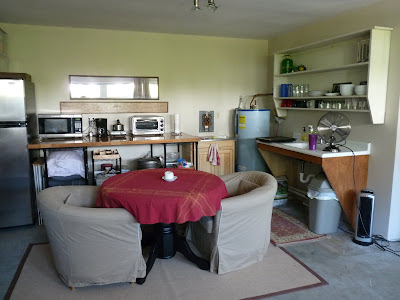 Building a new shop allowed us to turn the 440 square foot garage into an apartment. I was very excited about this project for a couple of reasons. First, I did not want to sell so much of my own furniture from my house in town (which is now a rental). The biggest pieces found a home in the apartment. And second, I consider living here a mission in stewardship. How could one live in a place like this and not share it? Daryl's children and grandchildren have spent years of their lives on this property and how could we all be comfortable in a 1280 square foot home? Making the garage into an apartment seemed like a good idea, and so far, I think it is working. No one is complaining or said they would not come back. Our neighbors have stayed, my dad has stayed, our friends Fred and Ruth have stayed, and both Daryl's daughters and all five of the grandchildren have stayed. What remains to be completed is the floor and we're still deciding what would be the best surface for sand, dogs, wetsuits and sleeping bags.